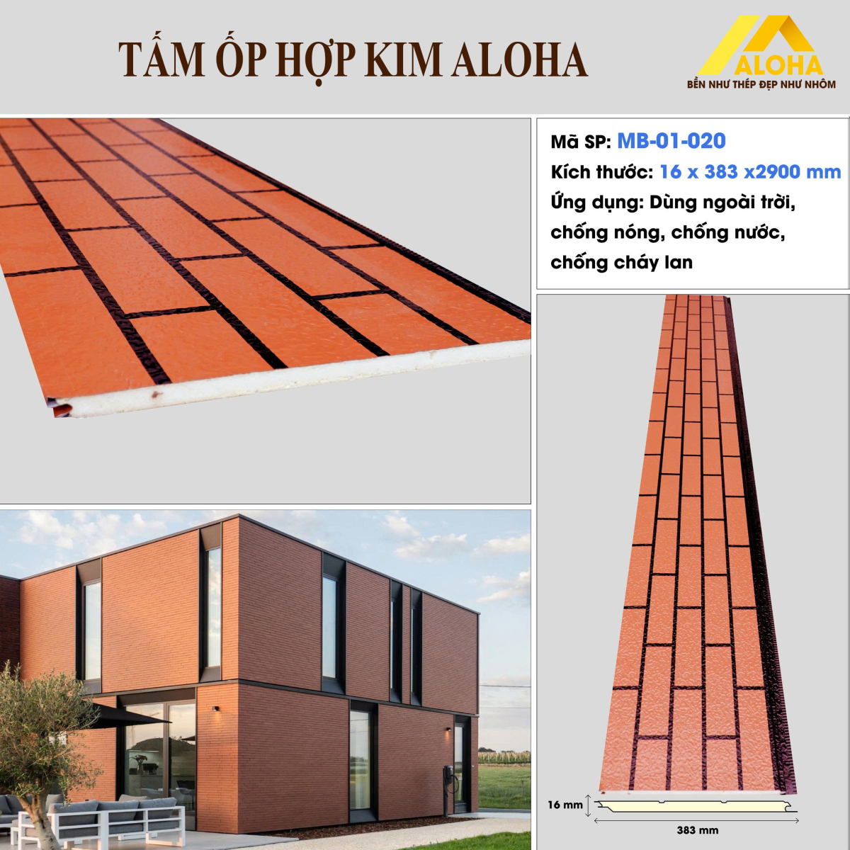 - Tấm ốp hợp kim Aloha là sản phẩm thế hệ mới, chuyên dùng cho vật liệu ngoài trời. Với tính năng vượt trội chống nước, chống gỉ sét, rất phù hợp làm nhà lắp ghép, nhà xưởng, nhà tiền chế, hay chống nóng trần nhà, hoặc trang trí cho các diện tường ngoài.