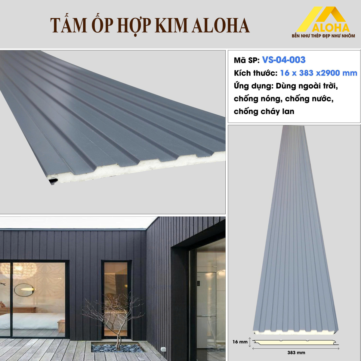 - Tấm ốp hợp kim Aloha là sản phẩm thế hệ mới, chuyên dùng cho vật liệu ngoài trời. Với tính năng vượt trội chống nước, chống gỉ sét, rất phù hợp làm nhà lắp ghép, nhà xưởng, nhà tiền chế, hay chống nóng trần nhà, hoặc trang trí cho các diện tường ngoài.
